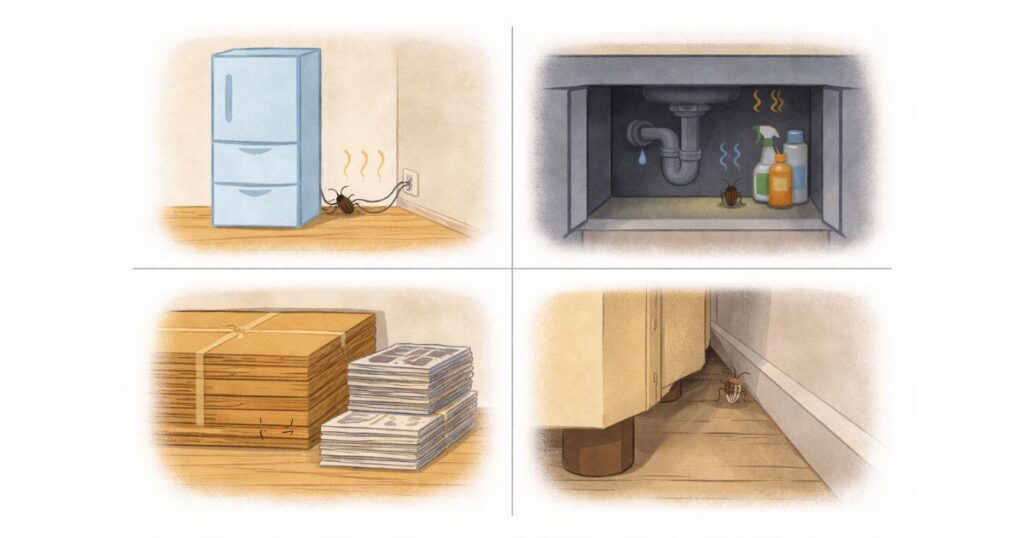 ゴキブリが家の中で潜みやすい代表的な場所を一覧で整理します。