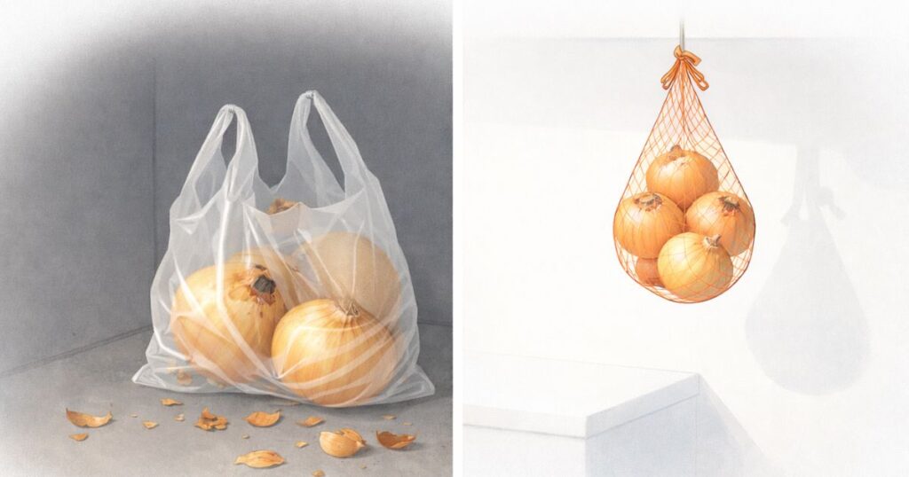 袋の中は通気性が悪く湿気がこもりやすいため、玉ねぎの匂いが周辺に広がりやすくなります。