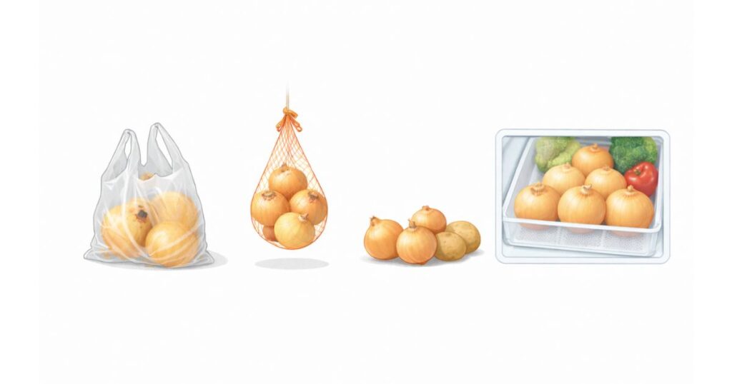- 保存方法(常温・吊るす・じゃがいもと一緒・冷蔵庫)ごとのリスクの違い